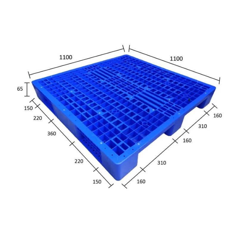 Pallet nhựa 3 chân 1100 x 1100 x 150mm là loại pallet có thiết kế một mặt với ba thanh đỡ chính (chân) chạy song song, tạo nên một kết cấu vững chắc và ổn định. Kích thước vuông 1100x1100mm là một trong những kích thước tiêu chuẩn, được sử dụng rộng rãi trong các kho hàng, nhà máy và đặc biệt phù hợp cho việc vận chuyển hàng hóa bằng container.