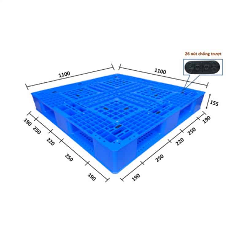 Kích thước 1100x1100mm là kích thước tiêu chuẩn quốc tế (Standard International Size), phù hợp với hầu hết các loại container xuất khẩu và các hệ thống kệ kho (Racking system) tại Việt Nam. Độ dày 155mm là chiều cao lý tưởng để các càng xe nâng máy và xe nâng tay có thể thao tác dễ dàng mà không bị cấn, đồng thời tạo khoảng cách an toàn tránh ẩm mốc từ mặt sàn.